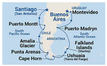 2026Buenos Aires ~ Montevideo ~ Puerto Madryn ~ Falkland-szigetek ~ Horn-fok ~ Ushuaia ~ Beagle-csatorna ~ Punta Arenas ~ Puerto Montt ~ San Antonio / Santiago