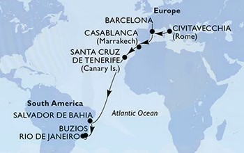 Civitavecchia (Rome) Italy ~ At Sea ~ Barcelona Spain ~ At Sea ~ Casablanca (Marrakech) Morocco ~ At Sea ~ Santa Cruz de Tenerife Spain ~ At Sea ~ At Sea ~ At Sea ~ At Sea ~ At Sea ~ At Sea ~ Salvador Brazil ~ At Sea ~ Buzios Brazil ~ Rio de Janeiro Brazil