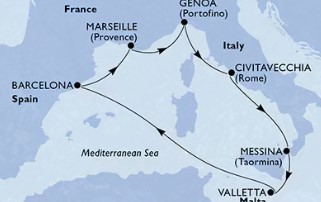 Genoa (Portofino) Italy ~ Civitavecchia (Rome) Italy ~ Messina (Taormina) Italy ~ Valletta Malta ~ At Sea ~ Barcelona Spain ~ Marseille (Provence) France ~ Genoa (Portofino) Italy