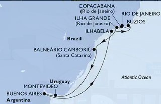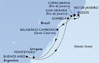 Montevideo Uruguay ~ Buenos Aires Argentina ~ At Sea ~ At Sea ~ Ilhabela Brazil ~ Buzios Brazil ~ Copacabana (Rio de Jainero) Brazil ~ Ilha Grande Brazil ~ Camboriu Brazil ~ At Sea ~ Montevideo Uruguay