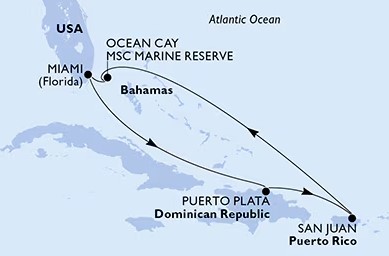 Miami United States ~ At Sea ~ Puerto Plata Dominican Republic ~ San Juan Puerto Rico ~ At Sea ~ At Sea ~ Ocean Cay MSC Marine Reserve Bahamas ~ Miami United States ~ At Sea ~ Isla de Roatan Honduras ~ Costa Maya Mexico ~ Cozumel Mexico ~ At Sea ~ Ocean Cay MSC Marine Reserve Bahamas ~ Miami United States
