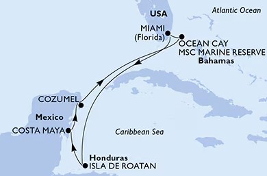 Miami United States ~ At Sea ~ Isla de Roatan Honduras ~ Costa Maya Mexico ~ Cozumel Mexico ~ At Sea ~ Ocean Cay MSC Marine Reserve Bahamas ~ Miami United States ~ At Sea ~ Puerto Plata Dominican Republic ~ San Juan Puerto Rico ~ At Sea ~ At Sea ~ Ocean Cay MSC Marine Reserve Bahamas ~ Miami United States