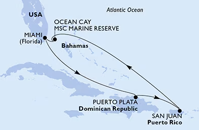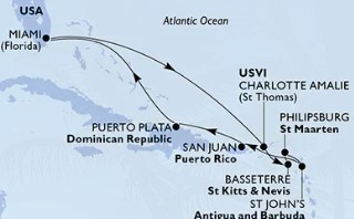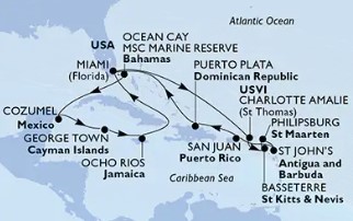 Miami United States ~ At Sea ~ At Sea ~ Charlotte Amalie (St. Thomas) Virgin Islands ~ Basseterre St Kitts & Nevis ~ Philipsburg St. Maarten ~ St. John's Antigua and Barbuda ~ San Juan Puerto Rico ~ Puerto Plata Dominican Republic ~ At Sea ~ Miami United States ~ Ocean Cay MSC Marine Reserve Bahamas ~ At Sea ~ Cozumel Mexico ~ George Town Cayman Islands ~ Ocho Rios Jamaica ~ At Sea ~ Miami United States