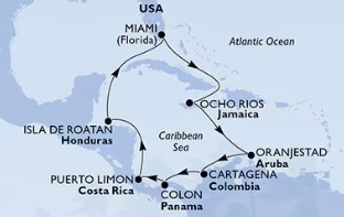 Miami United States ~ At Sea ~ Ocho Rios Jamaica ~ At Sea ~ Oranjestad Aruba ~ Cartagena Colombia ~ Colon Panama ~ Puerto Limon Costa Rica ~ At Sea ~ Isla de Roatan Honduras ~ At Sea ~ Miami United States