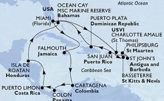 Miami United States ~ At Sea ~ Falmouth Jamaica ~ At Sea ~ Cartagena Colombia ~ Colon Panama ~ Puerto Limon Costa Rica ~ At Sea ~ Isla de Roatan Honduras ~ At Sea ~ Ocean Cay MSC Marine Reserve Bahamas ~ Miami United States ~ At Sea ~ At Sea ~ Charlotte Amalie (St. Thomas) Virgin Islands ~ Basseterre St Kitts & Nevis ~ Philipsburg St. Maarten ~ St. John's Antigua and Barbuda ~ San Juan Puerto Rico ~ Puerto Plata Dominican Republic ~ At Sea ~ Miami United States