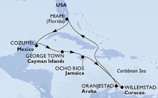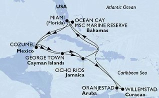 Miami United States ~ At Sea ~ Cozumel Mexico ~ George Town Cayman Islands ~ Ocho Rios Jamaica ~ At Sea ~ Willemstad Cura�ao ~ Oranjestad Aruba ~ At Sea ~ At Sea ~ Miami United States ~ Ocean Cay MSC Marine Reserve Bahamas ~ At Sea ~ Cozumel Mexico ~ George Town Cayman Islands ~ Ocho Rios Jamaica ~ At Sea ~ Miami United States