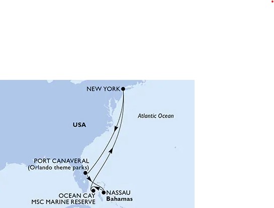 New York United States ~ At Sea ~ PortCanaveral United States ~ Nassau Bahamas ~ Ocean Cay MSC Marine Reserve Bahamas ~ At Sea ~ At Sea ~ New York United States