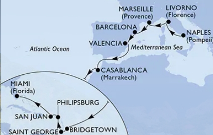 Naples (Pompeii) Italy ~ Livorno (Florence) Italy ~ Marseille (Provence) France ~ Barcelona Spain ~ Valencia Spain ~ At Sea ~ Casablanca (Marrakech) Morocco ~ At Sea ~ At Sea ~ At Sea ~ At Sea ~ At Sea ~ At Sea ~ At Sea ~ At Sea ~ Bridgetown Barbados ~ Saint George Grenada ~ At Sea ~ Philipsburg St. Maarten ~ San Juan Puerto Rico ~ At Sea ~ At Sea ~ Miami United States