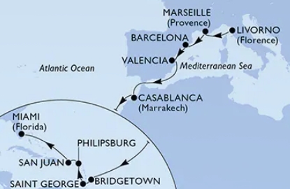 Livorno (Florence) Italy ~ Marseille (Provence) France ~ Barcelona Spain ~ Valencia Spain ~ At Sea ~ Casablanca (Marrakech) Morocco ~ At Sea ~ At Sea ~ At Sea ~ At Sea ~ At Sea ~ At Sea ~ At Sea ~ At Sea ~ Bridgetown Barbados ~ Saint George Grenada ~ At Sea ~ Philipsburg St. Maarten ~ San Juan Puerto Rico ~ At Sea ~ At Sea ~ Miami United States
