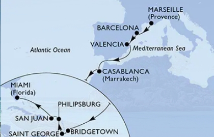 Marseille (Provence) France ~ Barcelona Spain ~ Valencia Spain ~ At Sea ~ Casablanca (Marrakech) Morocco ~ At Sea ~ At Sea ~ At Sea ~ At Sea ~ At Sea ~ At Sea ~ At Sea ~ At Sea ~ Bridgetown Barbados ~ Saint George Grenada ~ At Sea ~ Philipsburg St. Maarten ~ San Juan Puerto Rico ~ At Sea ~ At Sea ~ Miami United States