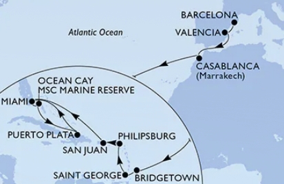 Barcelona Spain ~ Valencia Spain ~ At Sea ~ Casablanca (Marrakech) Morocco ~ At Sea ~ At Sea ~ At Sea ~ At Sea ~ At Sea ~ At Sea ~ At Sea ~ At Sea ~ Bridgetown Barbados ~ Saint George Grenada ~ At Sea ~ Philipsburg St. Maarten ~ San Juan Puerto Rico ~ At Sea ~ At Sea ~ Miami United States ~ Ocean Cay MSC Marine Reserve Bahamas ~ At Sea ~ Puerto Plata Dominican Republic ~ At Sea ~ Miami United States