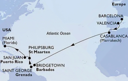 Barcelona Spain ~ Valencia Spain ~ At Sea ~ Casablanca (Marrakech) Morocco ~ At Sea ~ At Sea ~ At Sea ~ At Sea ~ At Sea ~ At Sea ~ At Sea ~ At Sea ~ Bridgetown Barbados ~ Saint George Grenada ~ At Sea ~ Philipsburg St. Maarten ~ San Juan Puerto Rico ~ At Sea ~ At Sea ~ Miami United States