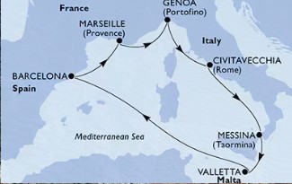 Barcelona Spain ~ Marseille (Provence) France ~ Genoa (Portofino) Italy ~ Civitavecchia (Rome) Italy ~ Messina (Taormina) Italy ~ Valletta Malta ~ At Sea ~ Barcelona Spain