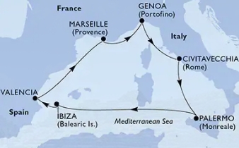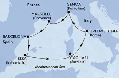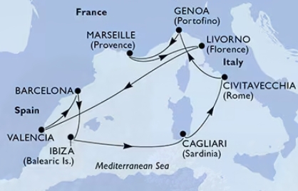Barcelona Spain ~ Ibiza (Baleari Is.) Spain ~ At Sea ~ Cagliari (Sardinia) Italy ~ Civitavecchia (Rome) Italy ~ Genoa (Portofino) Italy ~ Marseille (Provence) France ~ Livorno (Florence) Italy ~ At Sea ~ Valencia Spain ~ Barcelona Spain