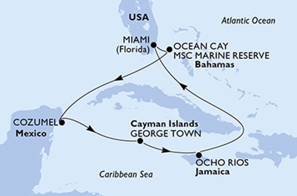 Útvonal: Miami (USA) –– Ocean Cay (Bahamák) – Cozumel (Mexikó) – George Town (Kajmán-szigetek) – Ocho Rios (Jamaica) - Miami (USA)