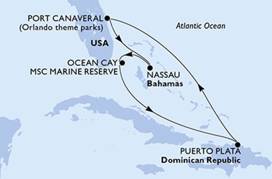 Útvonal: Port Canaveral (USA) – Nassau (Bahamák) – Ocean Cay (Bahamák) – Tengeren – Puerto Plata (Dominikai Köztársaság) – Tengeren – Miami (USA)